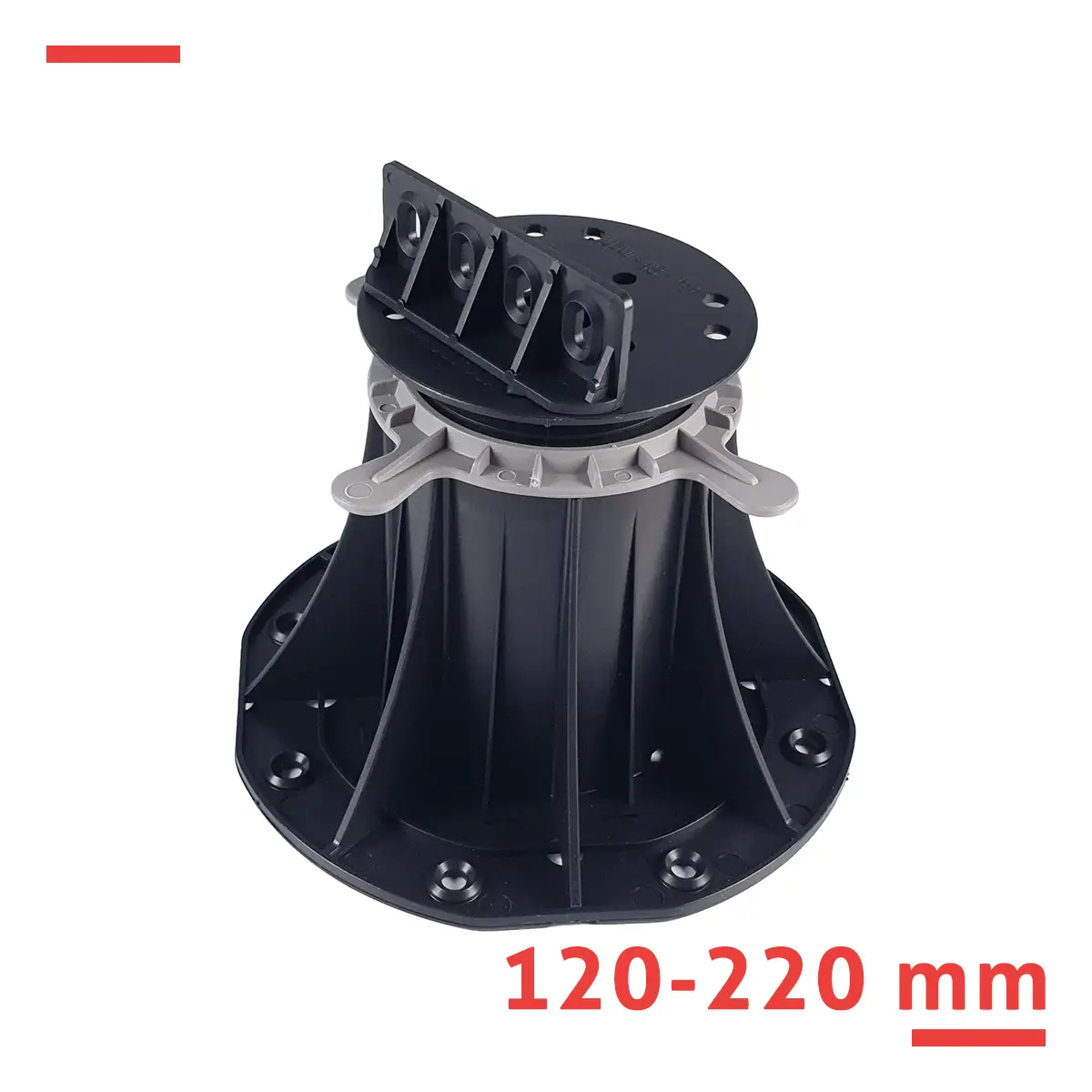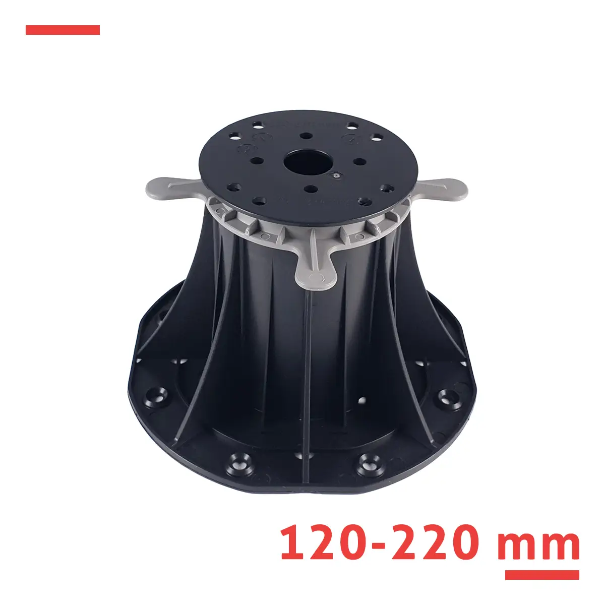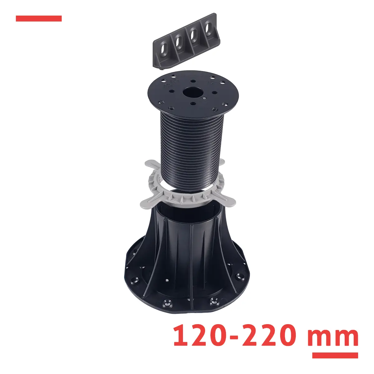 Wspornik tarasowy regulowany serii STANDARD 120–220 mm do legarów – do wyższych tarasów z desek drewnianych lub WPC na stropodachach i podestach z dużą różnicą poziomów. Płynna regulacja, wytrzymałość 1 000 kg, PP odporny na warunki atmosferyczne.