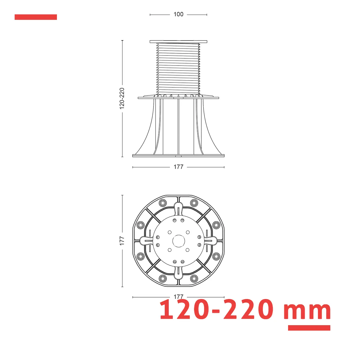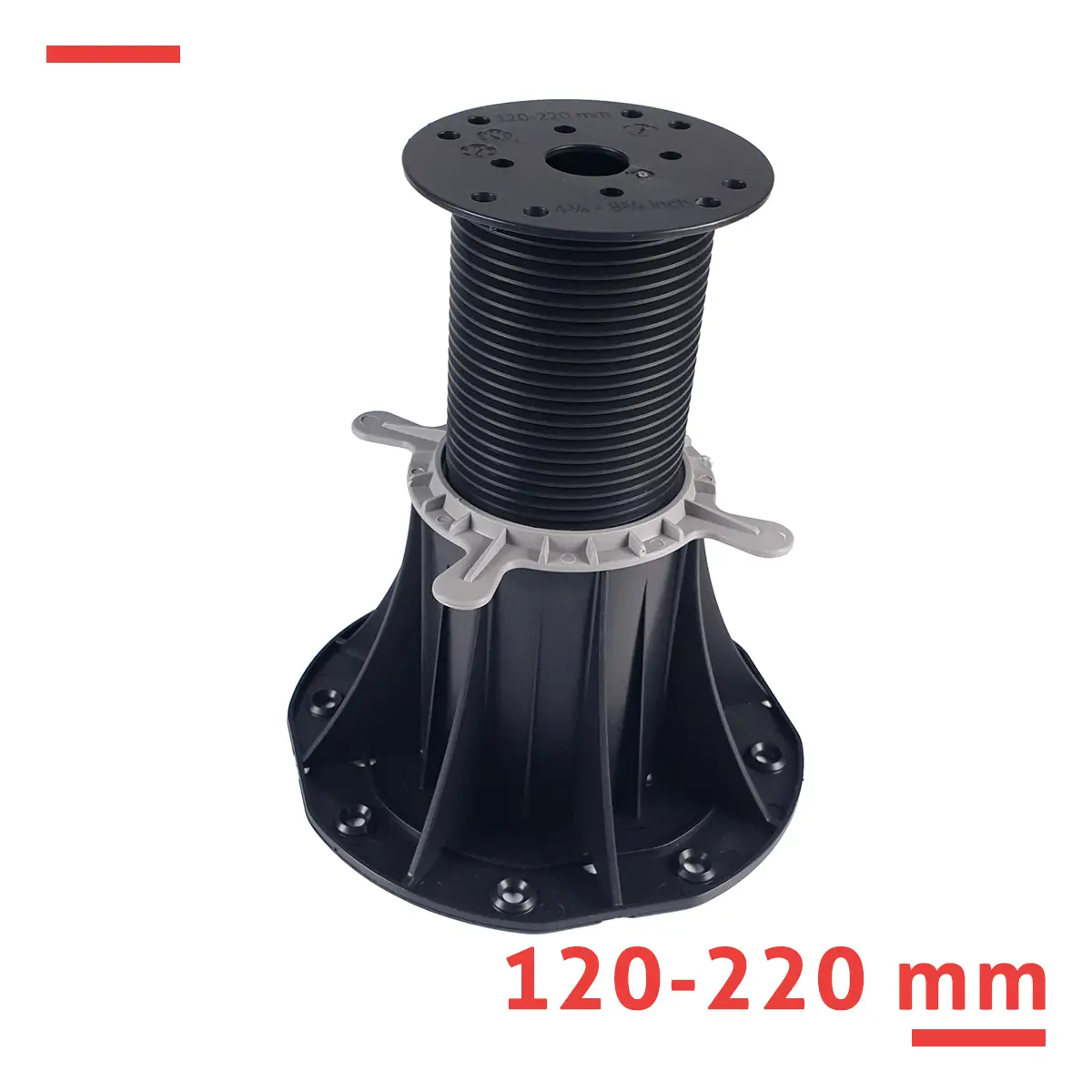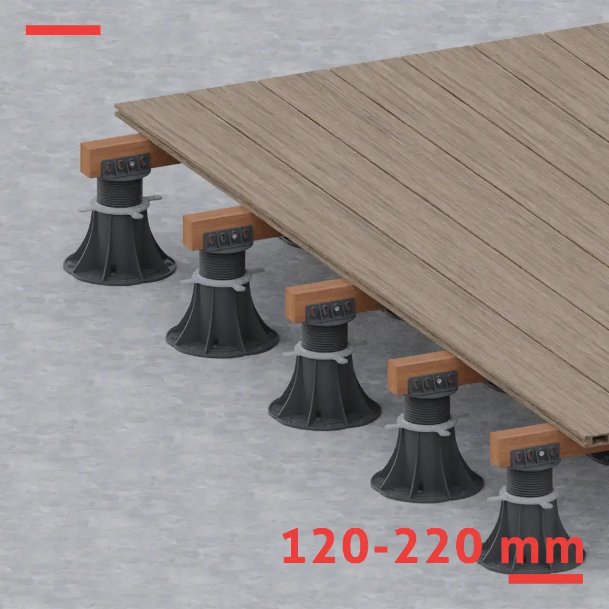 Wspornik tarasowy regulowany serii STANDARD 120–220 mm do legarów – do wyższych tarasów z desek drewnianych lub WPC na stropodachach i podestach z dużą różnicą poziomów. Płynna regulacja, wytrzymałość 1 000 kg, PP odporny na warunki atmosferyczne.