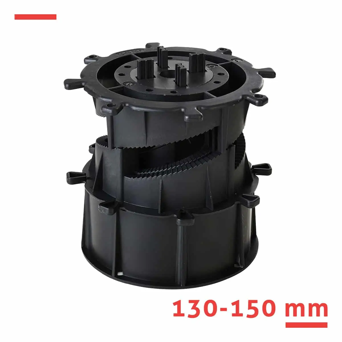 Wspornik regulowany serii SPIRAL 130–150 mm do płyt tarasowych – schodkowa regulacja, nośność 2 000 kg. Stabilna i precyzyjna podstawa dla płyt tarasowych na podłożach wymagających wyraźnej przestrzeni podtarasowej.