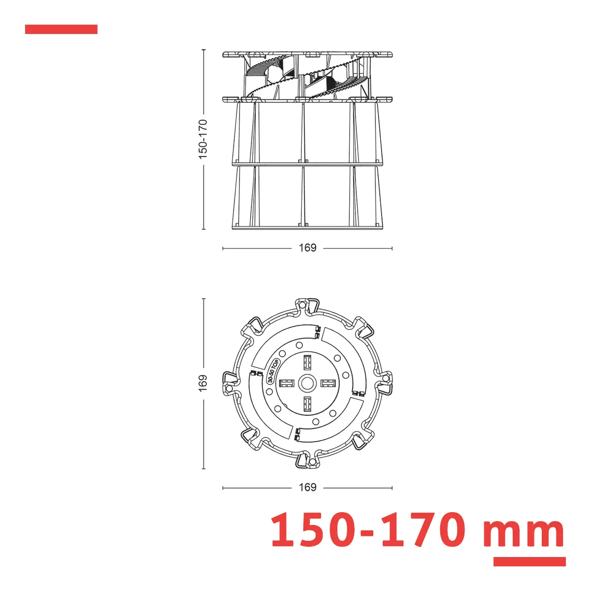 Wspornik regulowany serii SPIRAL 150–170 mm do legarów – schodkowa regulacja co ok. 1 mm, nośność 2 000 kg. Stosowany w systemach legarowych wymagających znacznej przestrzeni podtarasowej dla instalacji lub drenażu.