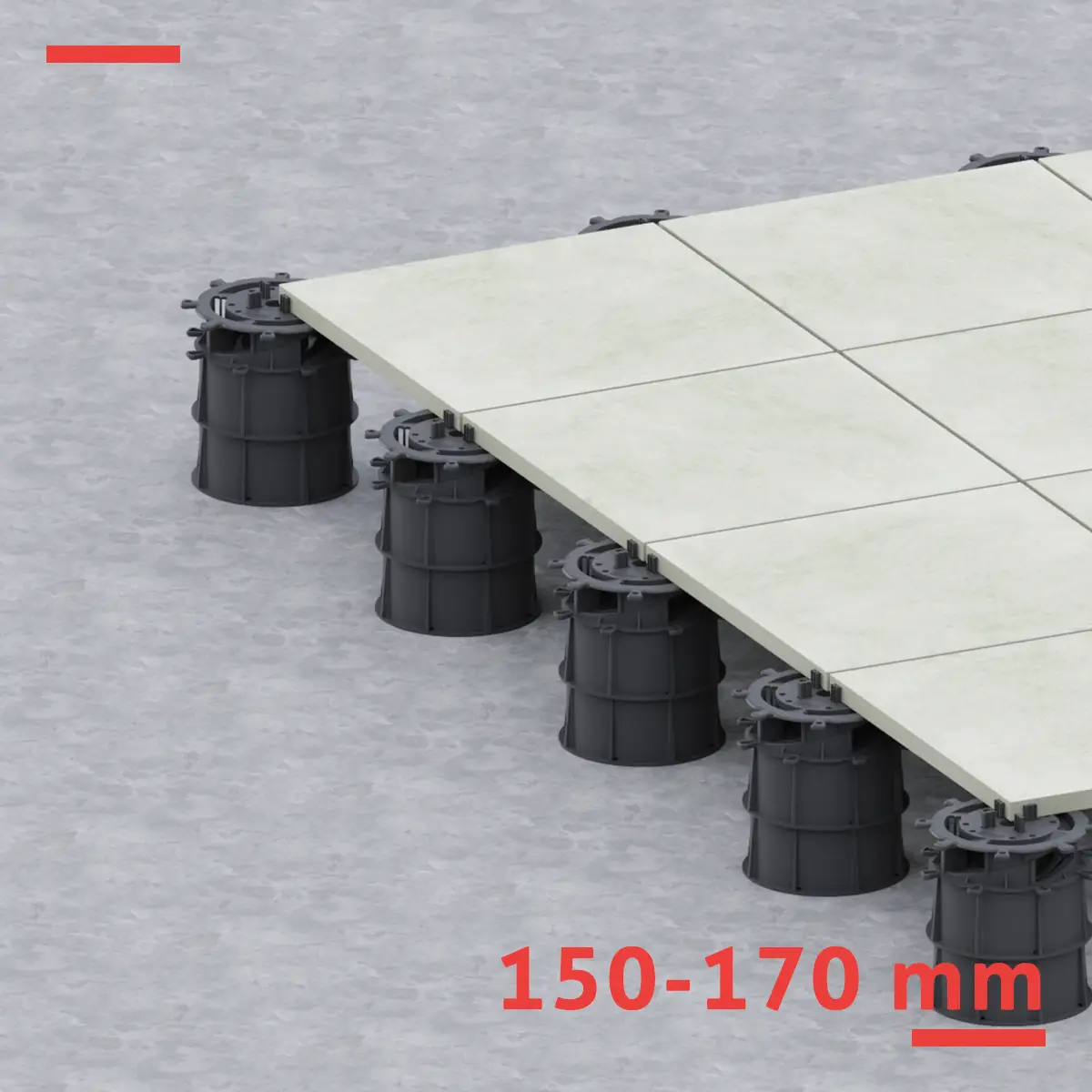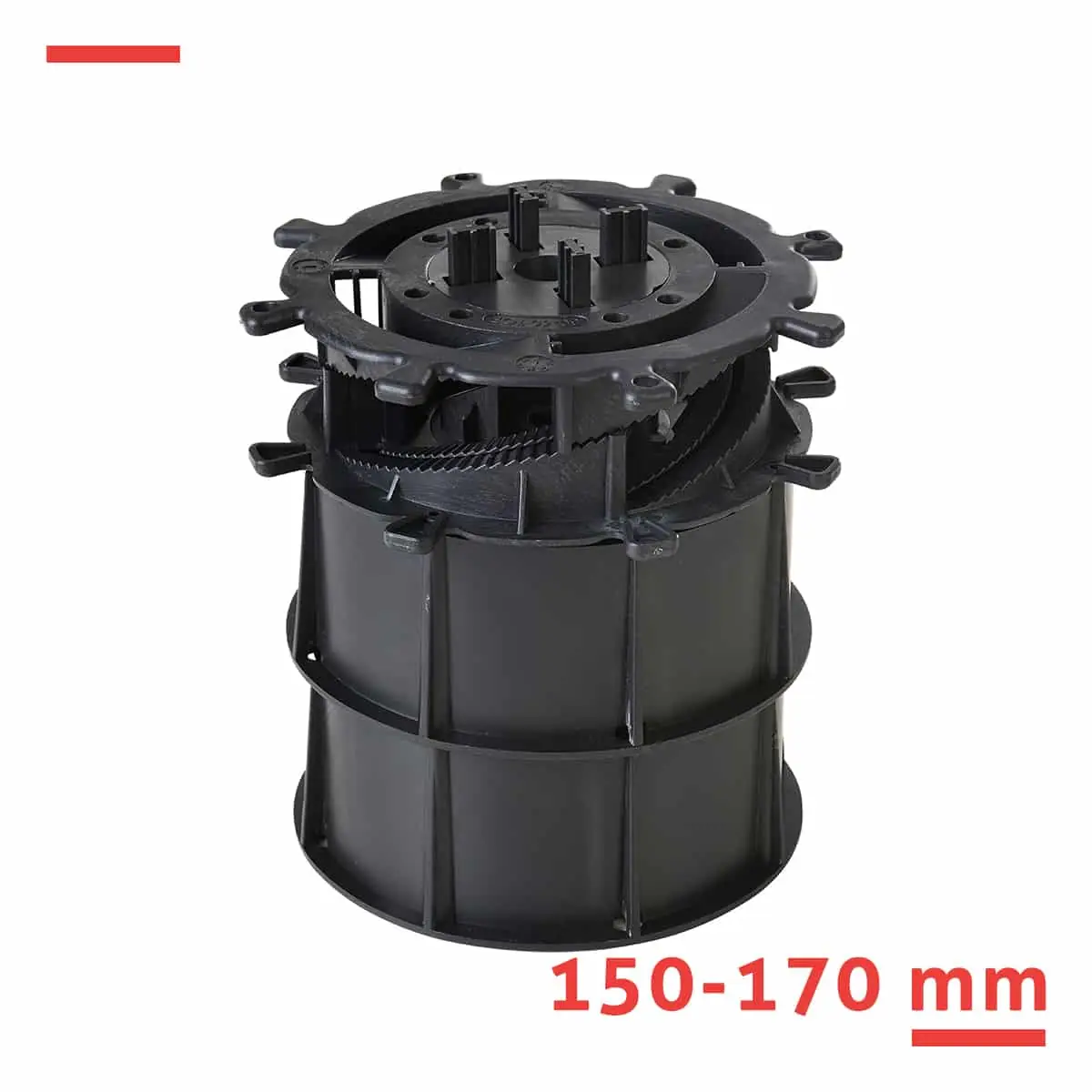 Wspornik regulowany serii SPIRAL 150–170 mm do płyt tarasowych – schodkowa regulacja co ok. 1 mm, nośność 2 000 kg. Sprawdzone rozwiązanie do montażu płyt na stropodachach z dużą różnicą poziomów.