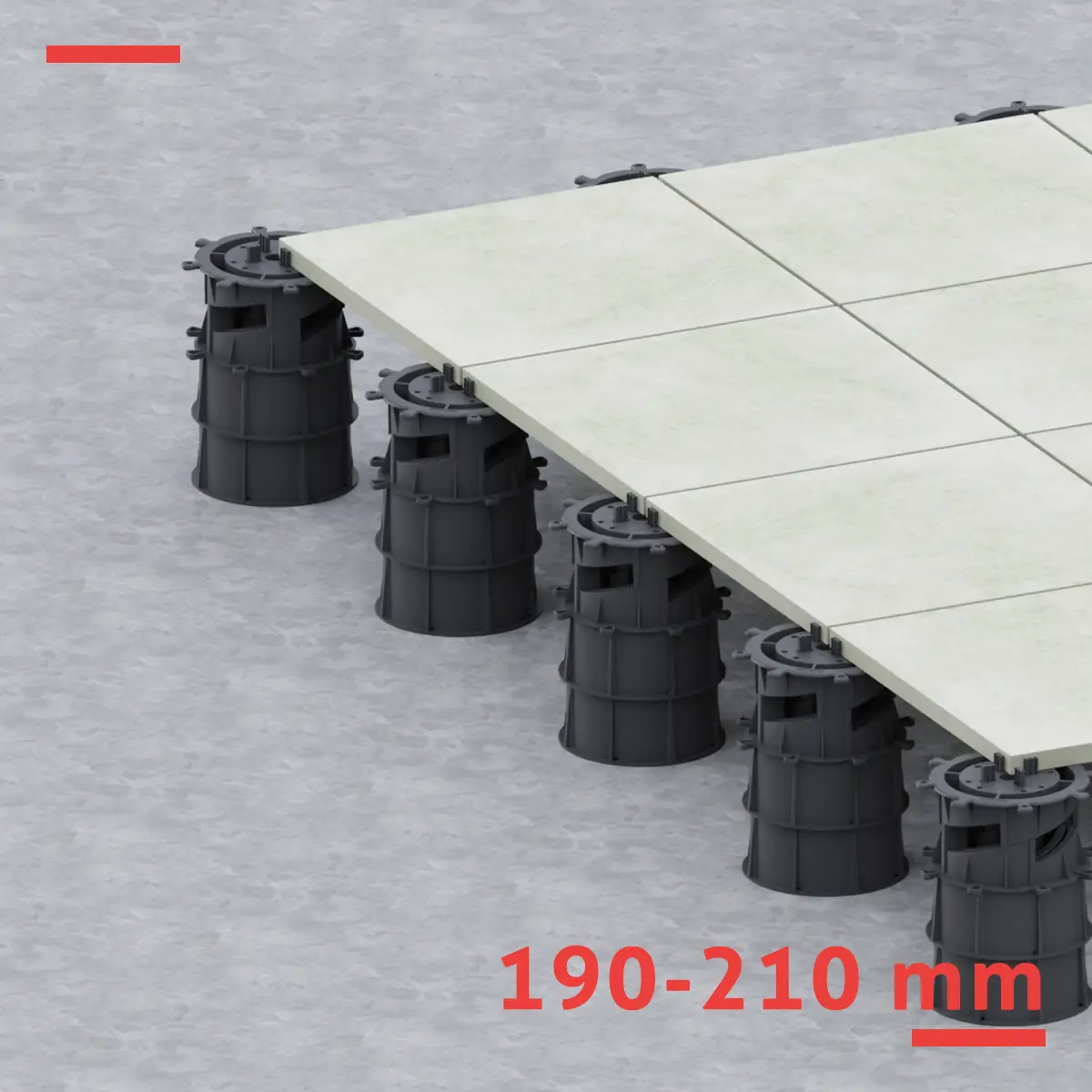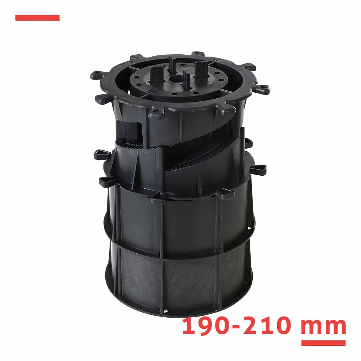 Wspornik regulowany serii SPIRAL 190–210 mm do płyt tarasowych – najwyższy model serii SPIRAL do płyt. Schodkowa regulacja co ok. 1 mm, nośność 2 000 kg. Solidna podstawa na najwyższe prześwity w tej serii.
