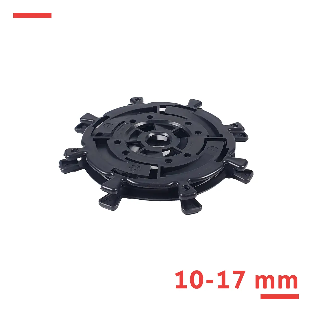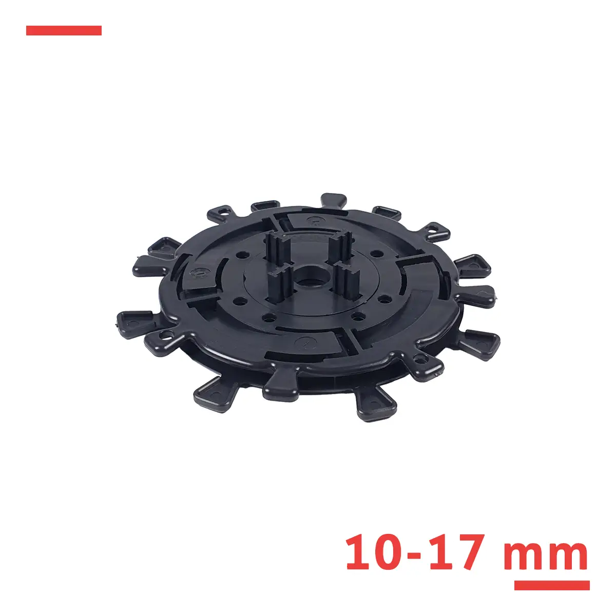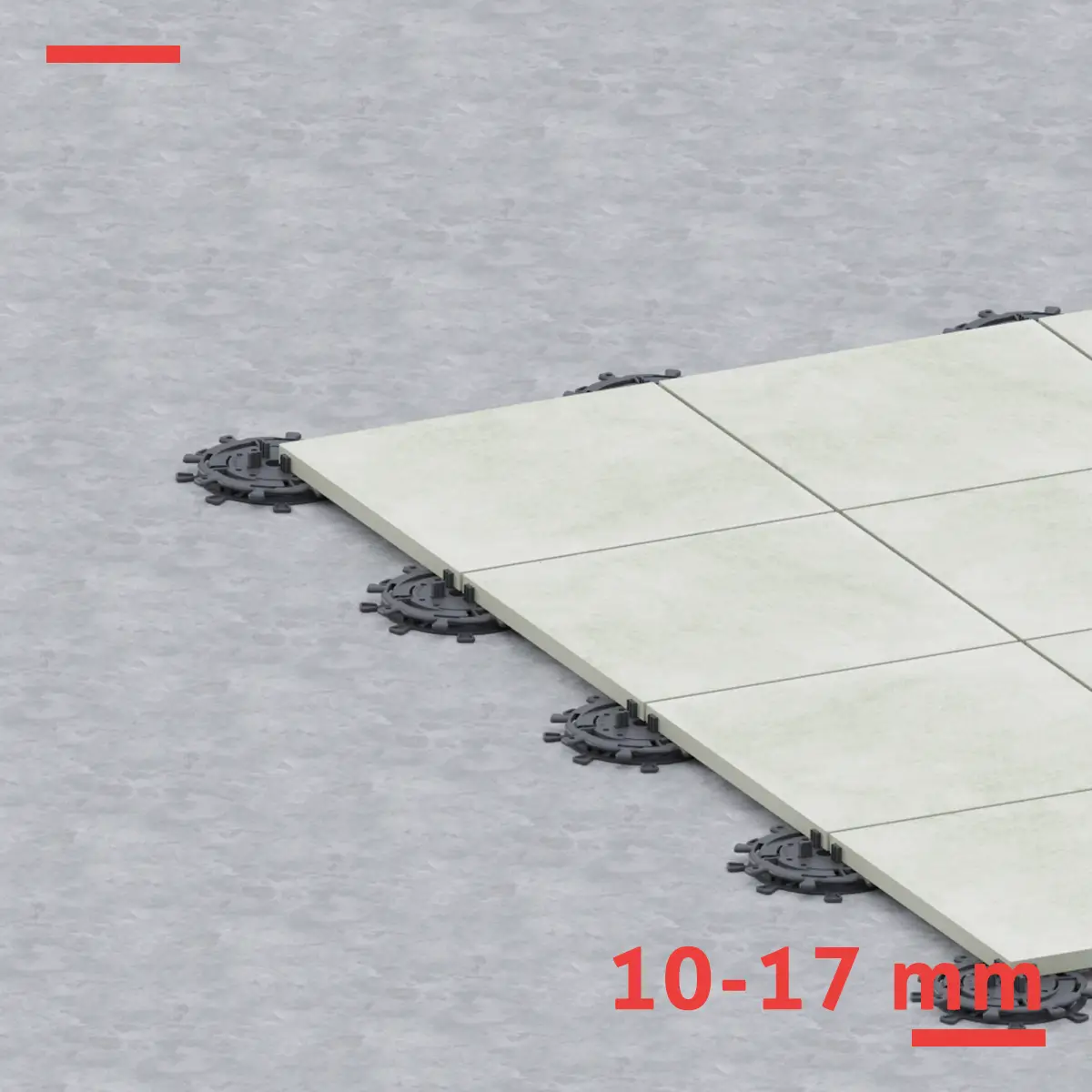 Wspornik regulowany serii SPIRAL 10–17 mm – najniższy model do montażu płyt tarasowych praktycznie na poziomie podłoża. Schodkowa regulacja co ok. 1 mm, nośność 2 000 kg. Idealny na balkony i tarasy na niskich wysokościach.