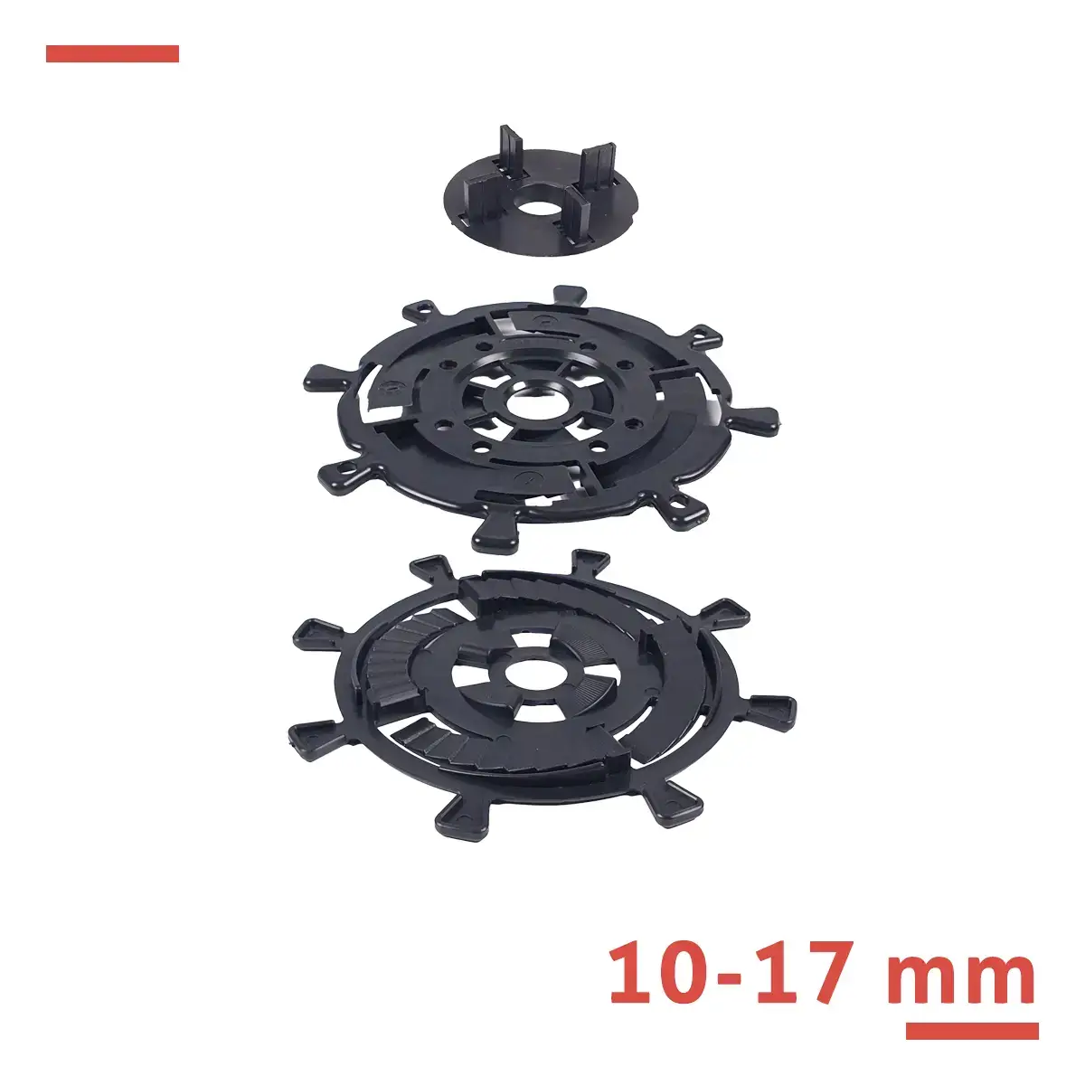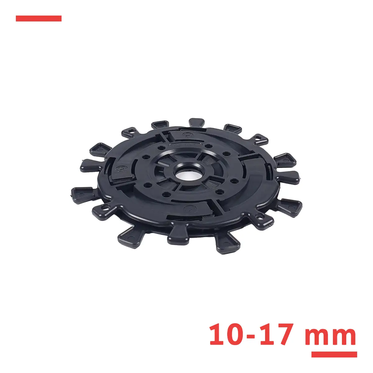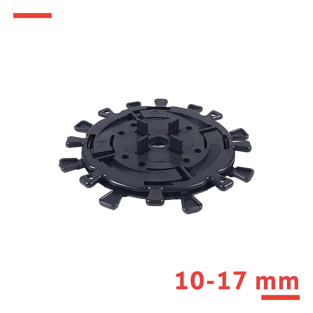 Wspornik regulowany serii SPIRAL 10–17 mm – najniższy model do montażu płyt tarasowych praktycznie na poziomie podłoża. Schodkowa regulacja co ok. 1 mm, nośność 2 000 kg. Idealny na balkony i tarasy na niskich wysokościach.