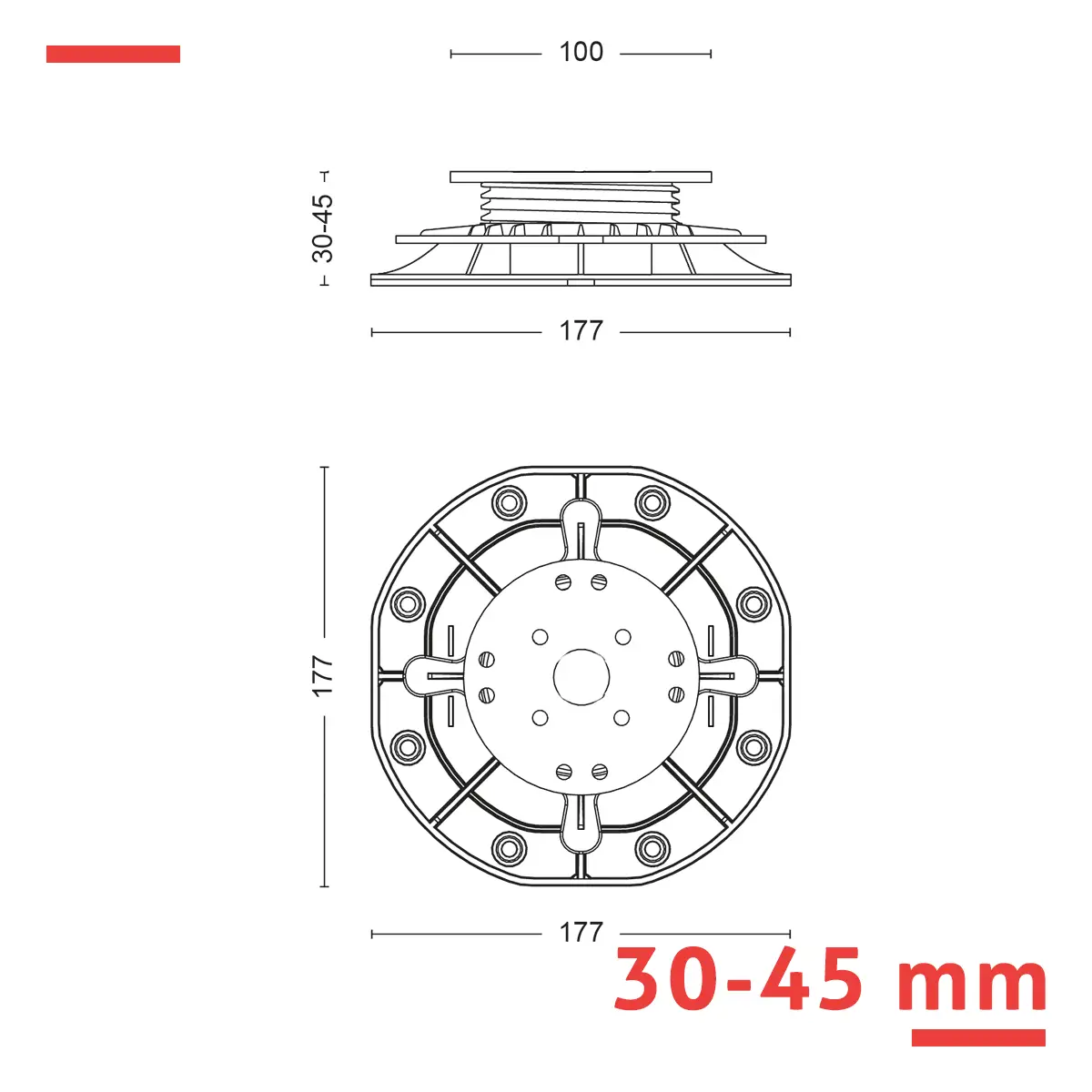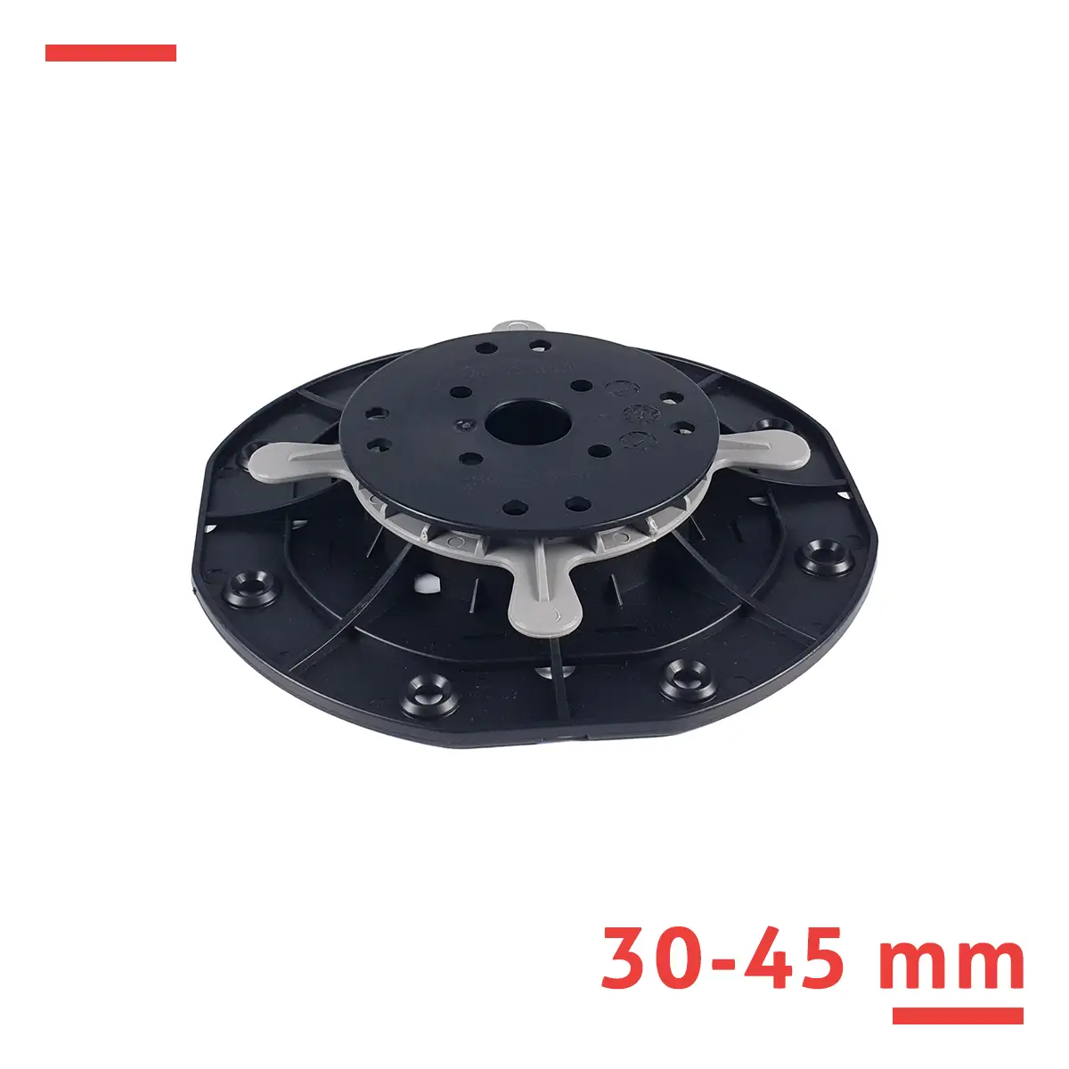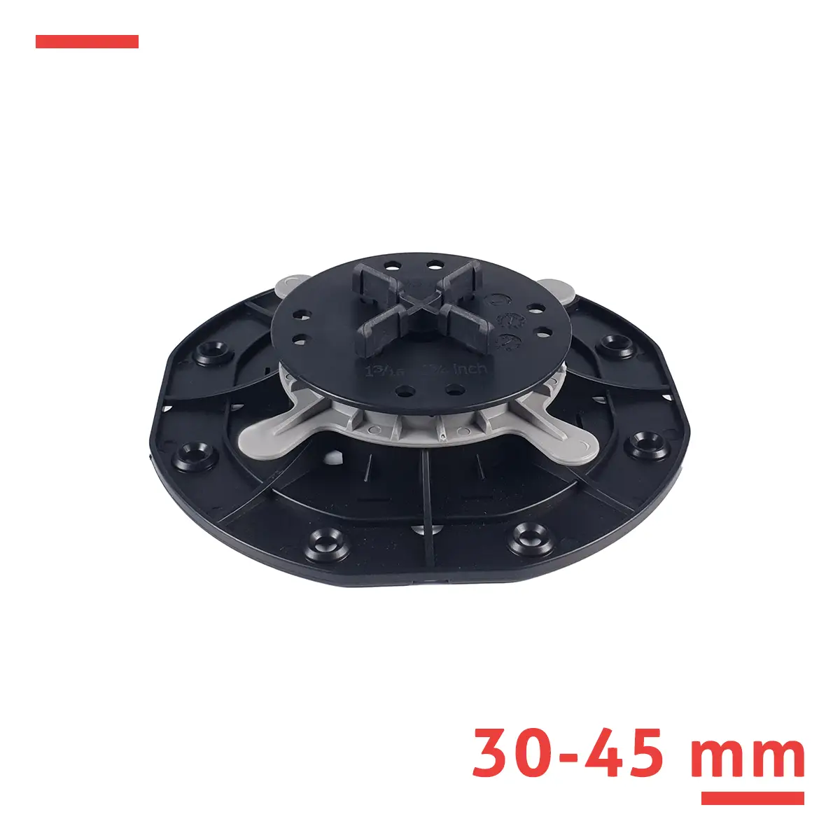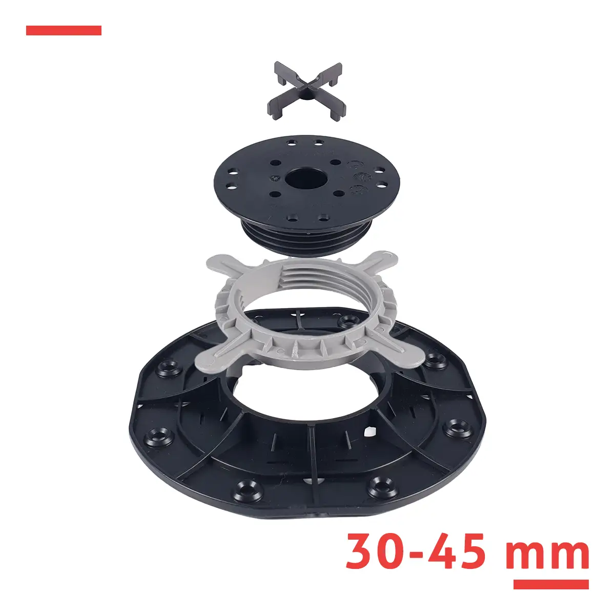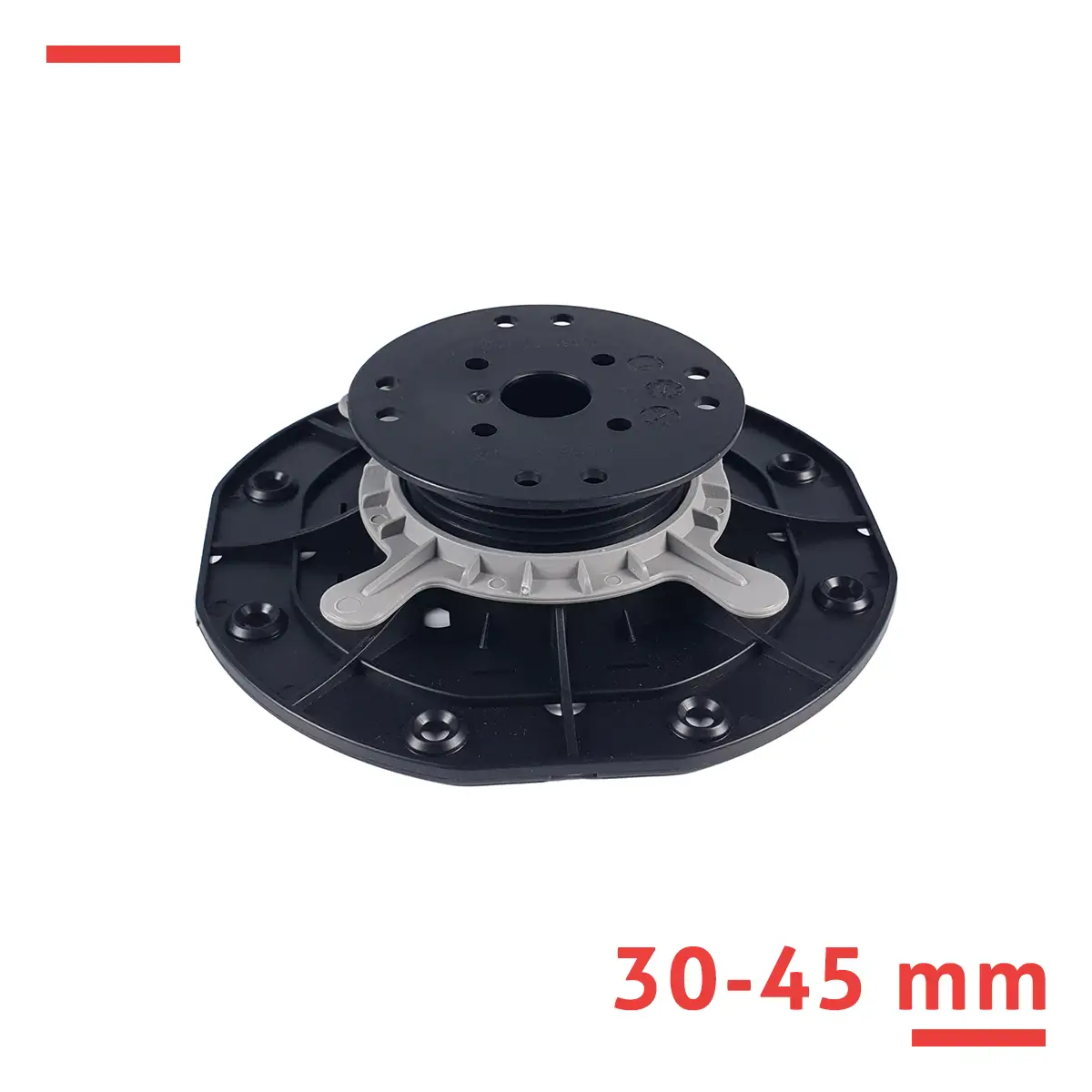 Wspornik tarasowy regulowany serii STANDARD 30–45 mm do montażu płyt tarasowych ceramicznych, kamiennych i betonowych. Płynna regulacja nakrętką umożliwia precyzyjne wypoziomowanie nawierzchni nawet przy nierównościach podłoża. Wytrzymałość 1 000 kg, materiał PP modyfikowany z Krajową Oceną Techniczną ITB.materiał PP modyfikowany z Krajową Oceną Techniczną ITB.